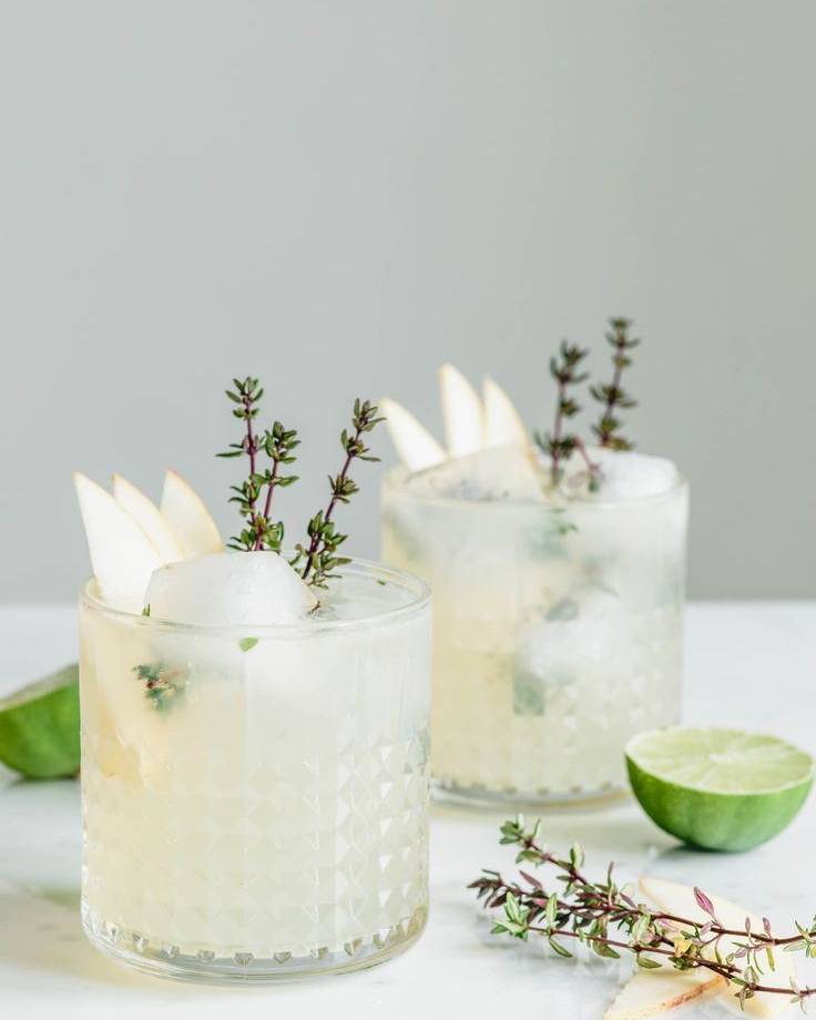 GCG Gin, Apfelsaft und Limettensaft in ein Glas füllen, mit Ginger Beer aufgießen. Anschließend das Glas mit den Eiswürfeln füllen. Thymianzweig leicht zwischen den Handflächen reiben, um die Aromen zu lösen und ins Glas geben. Optional das Getränk mit Apfelscheiben garnieren.